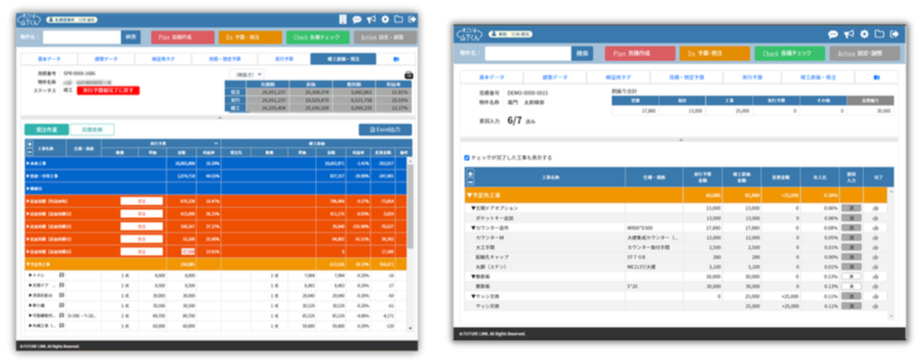 全ての工事が見積から竣工原価まで横に繋がっているので、